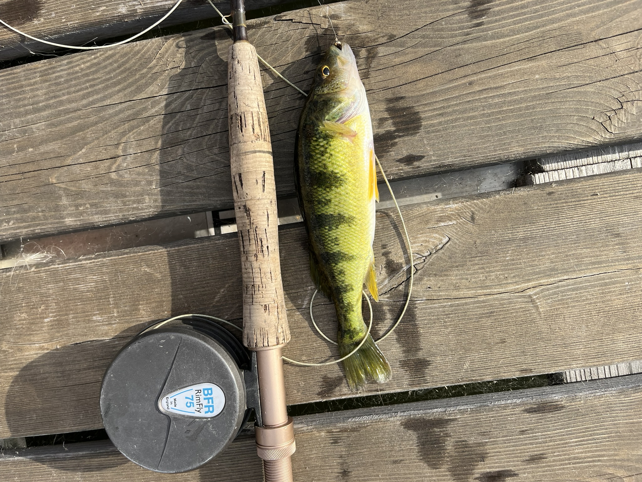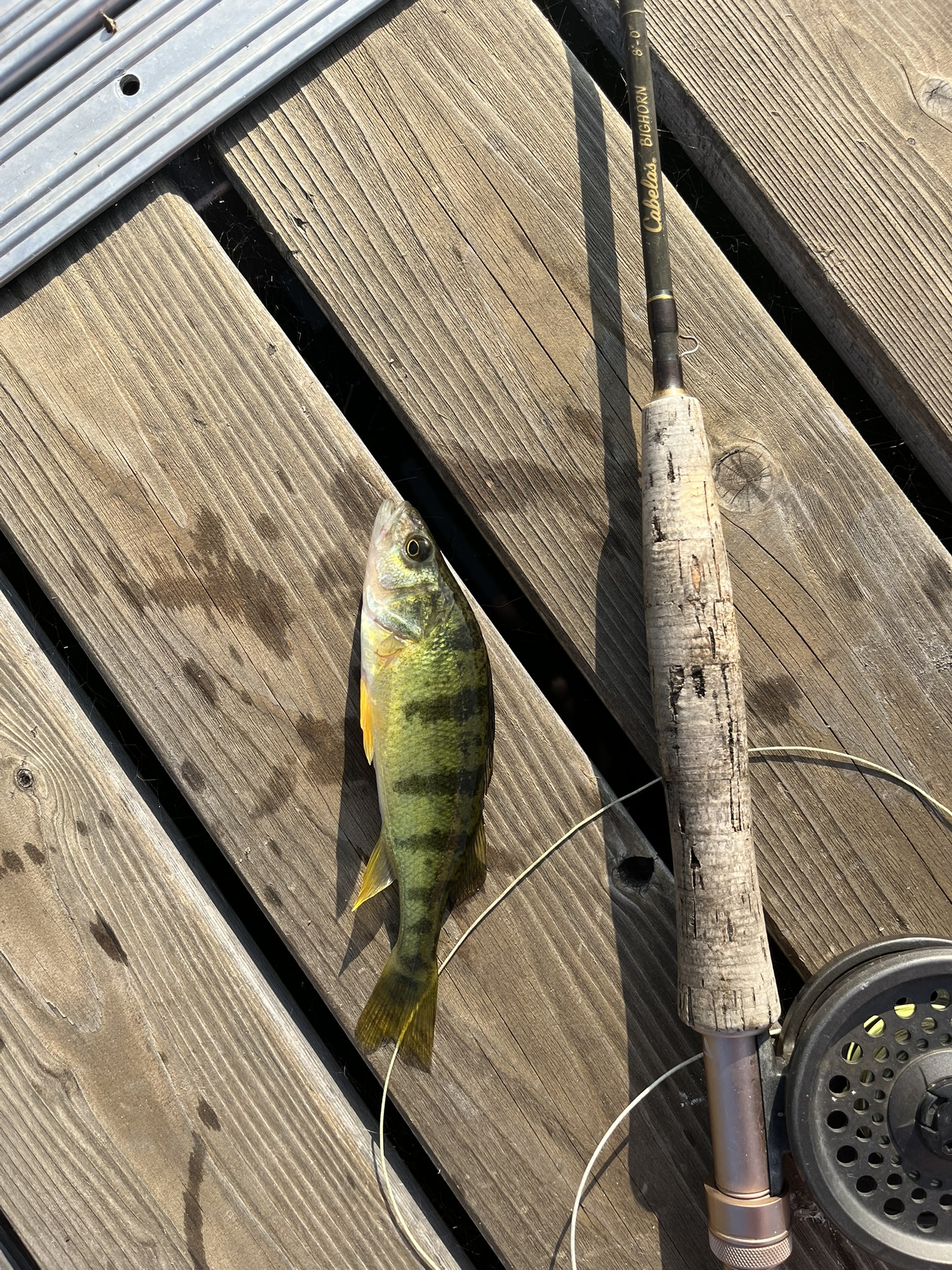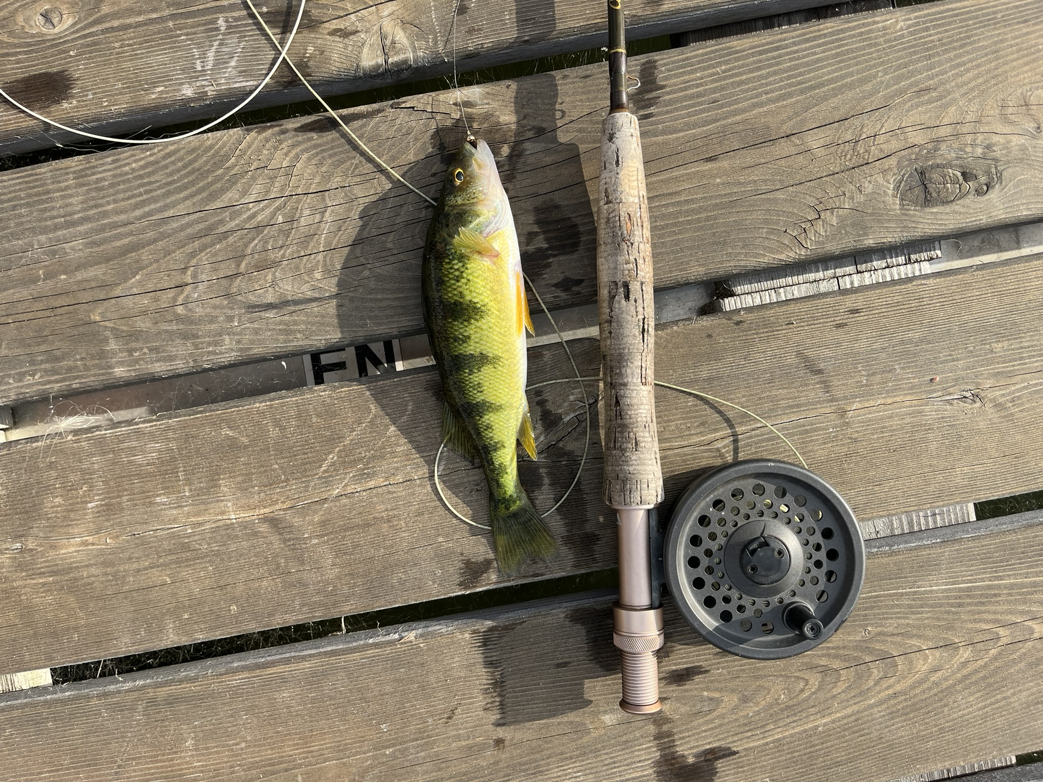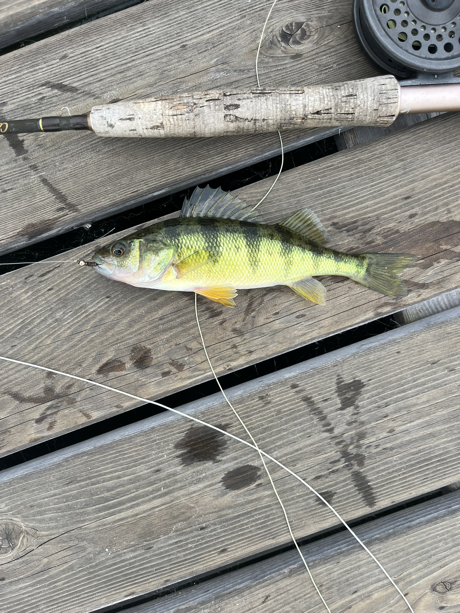Just off the dock is a weed bad that stretches all along the cabin row. I grab my 4 weight fly rod, usually with a Bead Head Copper John fly, and cast it 20 – 30 feet straight out. I know there are perch there. There are always Perch there, and they love that simple little fly. Many of the Perch are barely able to pull the line but there are a few that will put a little bend in the light weight rod. The cork section on my fly rod is 7″ so anything that big is a good perch, at least by Fishing Off the Dock standards.