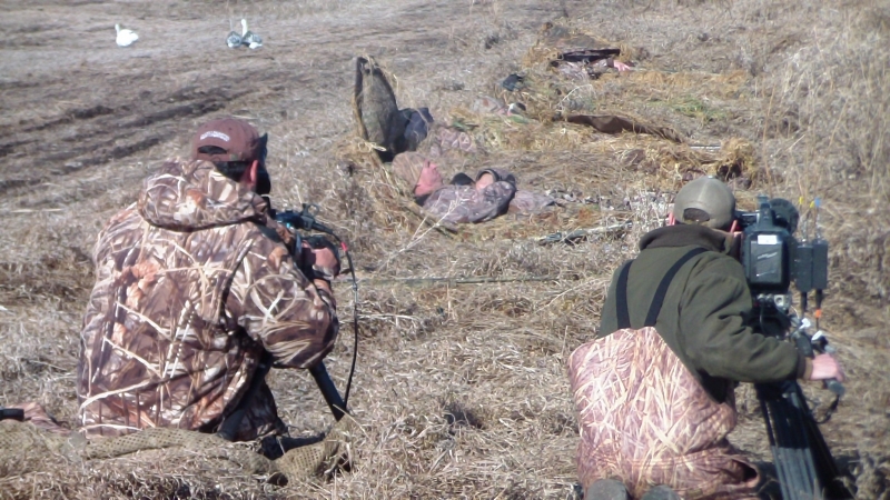 A shot during the action, the camera crew of Ducks Unlimited TV films some goose hunting in Saskatchewan